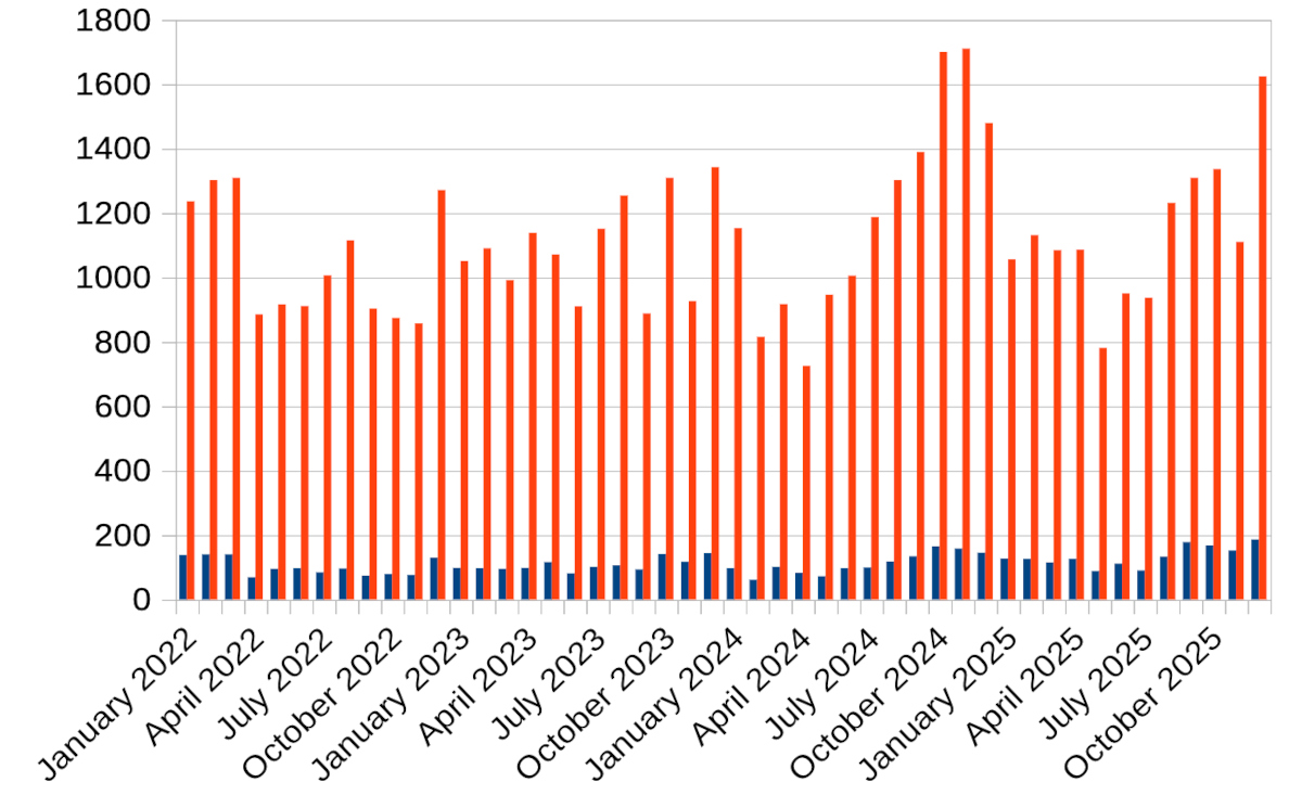 | Re: Point to point passenger numbers since the pandemic In "The Wider Picture in the United Kingdom" [370482/31376/51] Posted by grahame at 21:11, 2nd January 2026 Already liked by Timmer | ![]() |