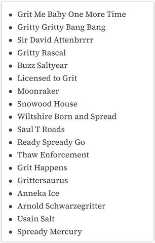 A shortlist was compiled from the 1,480 suggestions received, with the gritter drivers themselves choosing the winners.