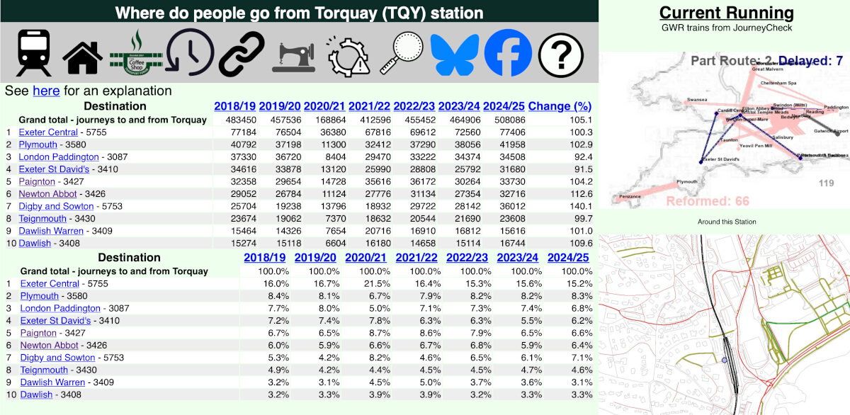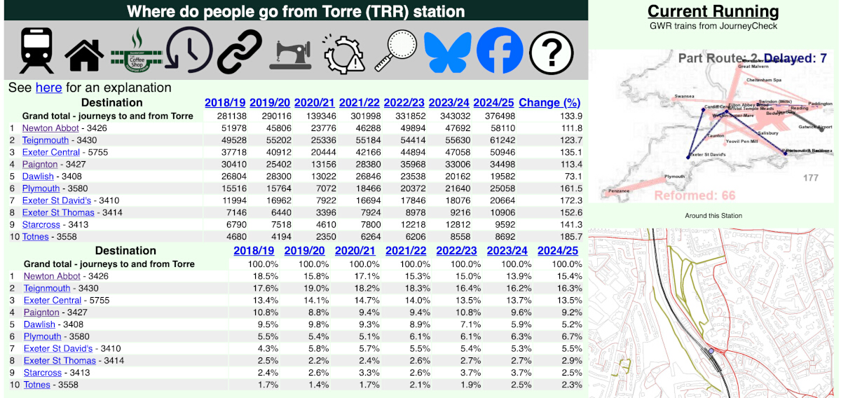 Source 2: Our own forum using https://raildata.org.uk - Rail Data Marketplace data. This shows destinations - using URLs such as https://www.passenger.chat/PGN.html (and change to TQY and TRR, and thre is a link on each page to give you the top 50.